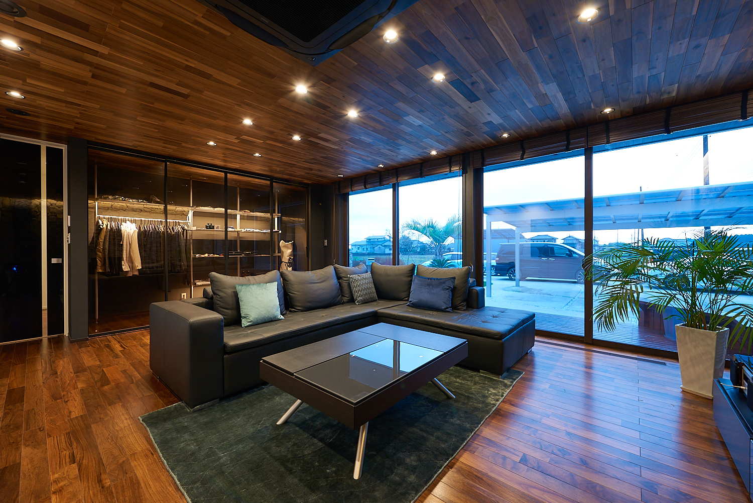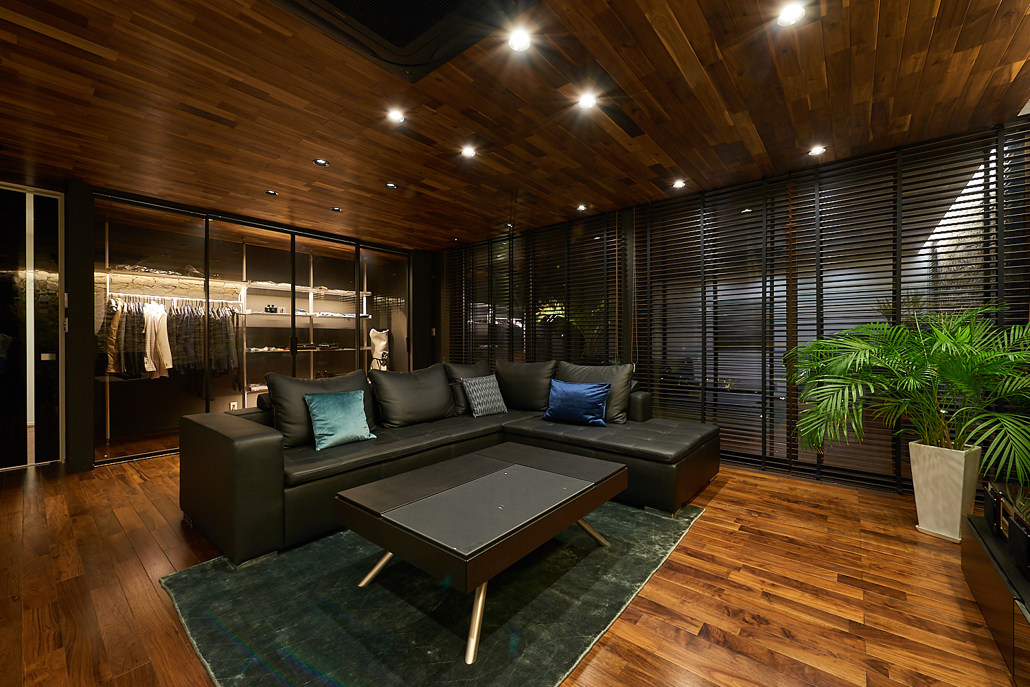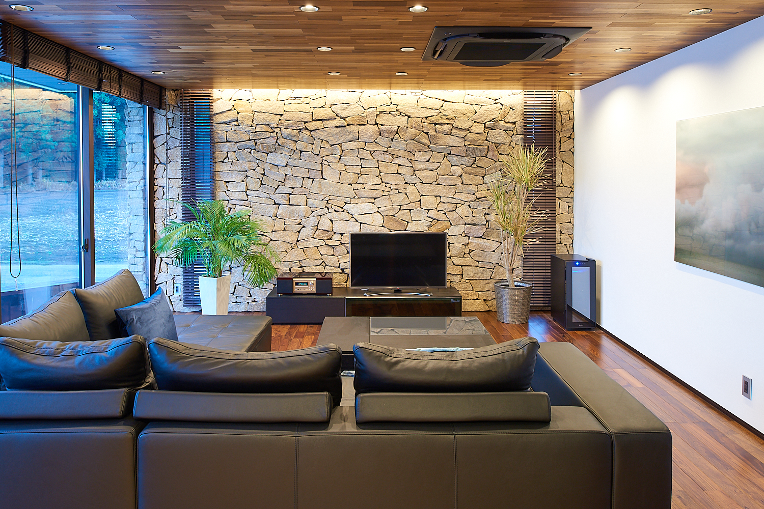 床にはブラックウォールナット、天井にはアカシアの無垢板を使い、絶妙な色彩コントラストが目に楽しい。壁一面を覆うのは、一つ一つ手で積み上げた天然石。外壁と素材を合わせることで外と中をあいまいにし、一体感を演出しています。